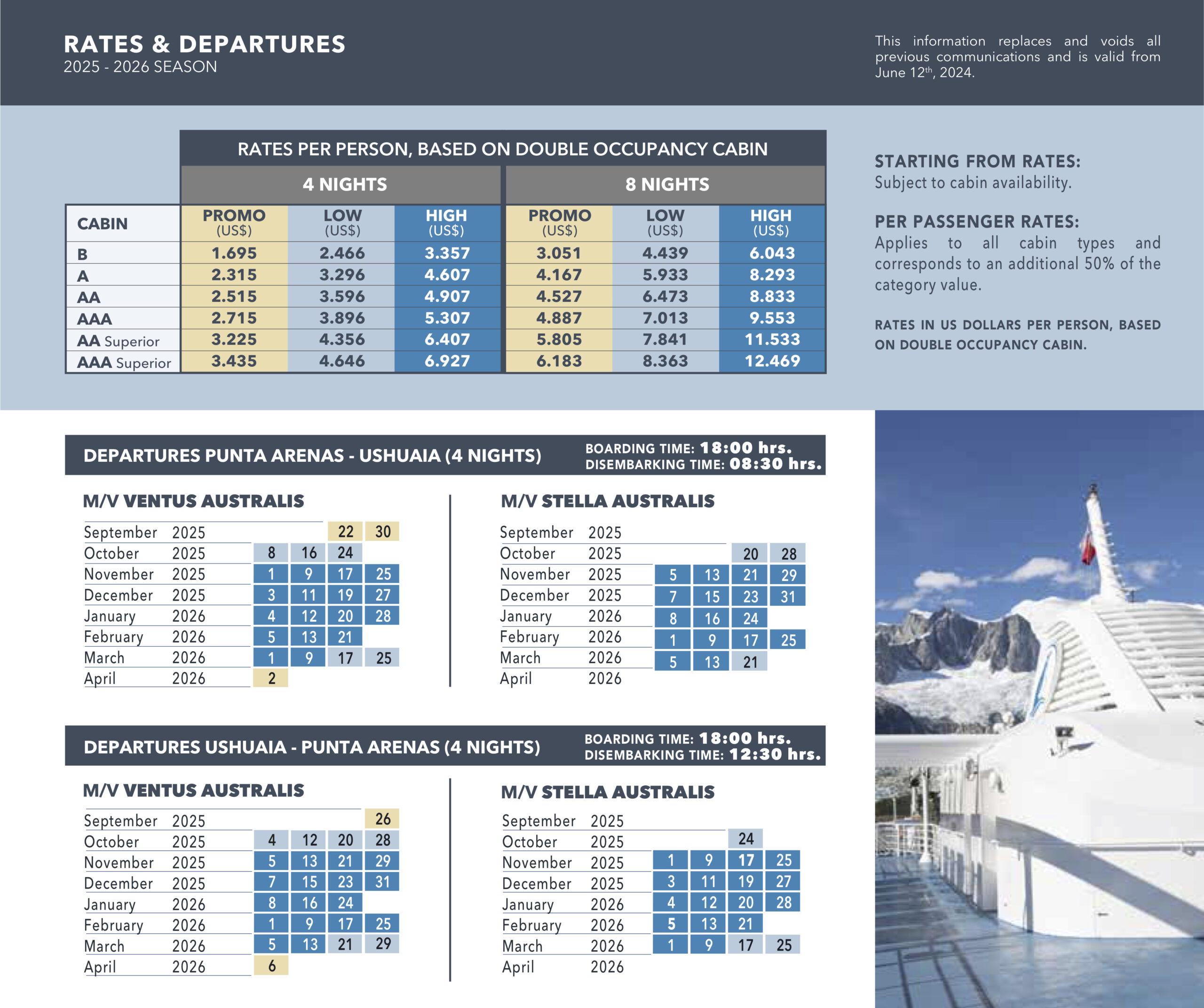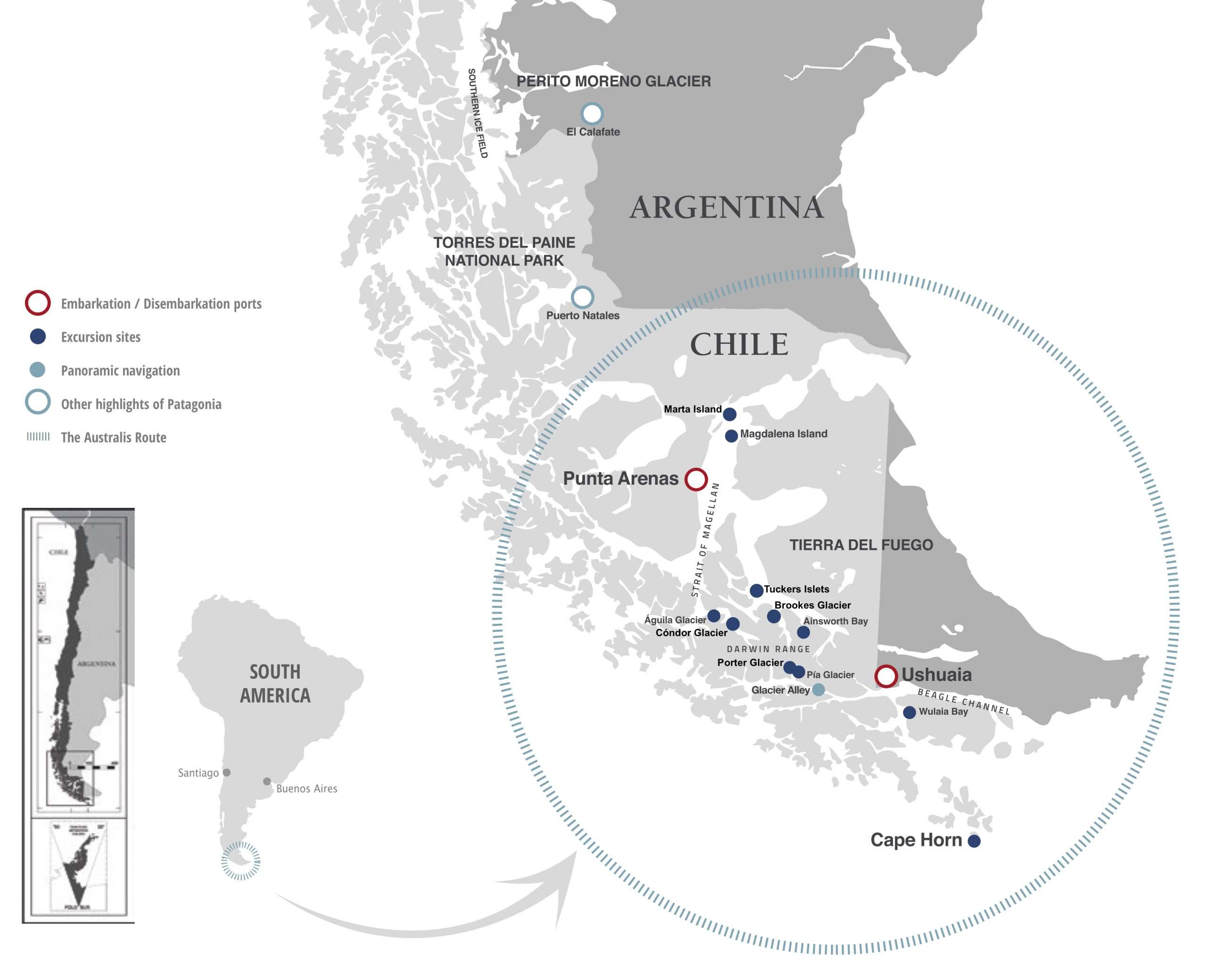 Given our decades of experience in the region, Australis had crea- ted itineraries that highlight the best of the waterways and islands of Patagonia. You can elect to sail with us for an entire week or on our 3 and 4 night one way itineraries from Punta Arenas (Chile) or Ushuaia (Argentina) — on roundtrip journeys that land you back in the same port where you started or straight-line itineraries that start at one city and end at the other. In addition, we feature a special land-and-sea itinerary that entails a drive across Tierra del Fuego (and its king penguin colony) and a cruise back through the archipelago. No matter which trip you choose, each and every Australis cruise blends Patagonia’s incredible scenery and wildlife with onboard ple- asures like gourmet cuisine, interesting presentations and comfy cabins. Shore landings are carried out in well-equipped Zodiacs and led by guides who are experts on the region’s flora, fauna, geology and human history.